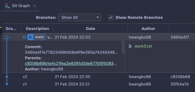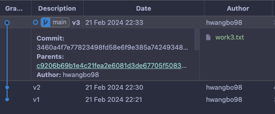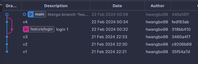 - 위와 같이 현재 v2까지 커밋이 된 것을 확인할 수 있다.
