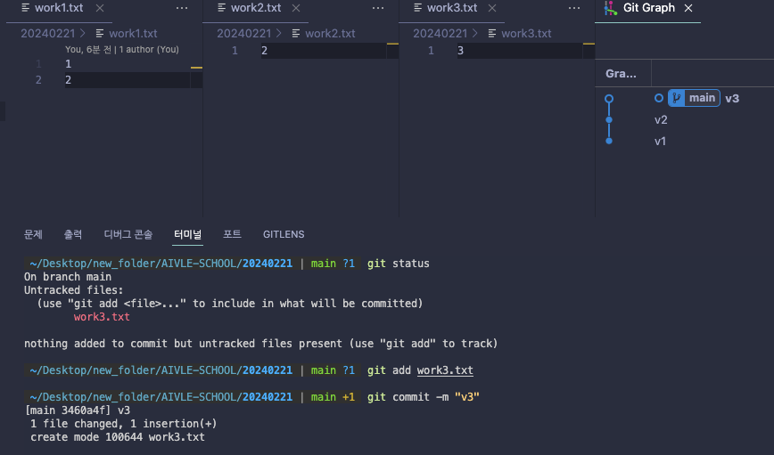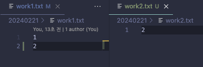 - 위와 같은 내용을 반복하면 된다. 이번에는 work1.txt에 2라는 내용을 추가하고, work2.txt를 만들어서 2라는 내용을 만들어 생성한다.