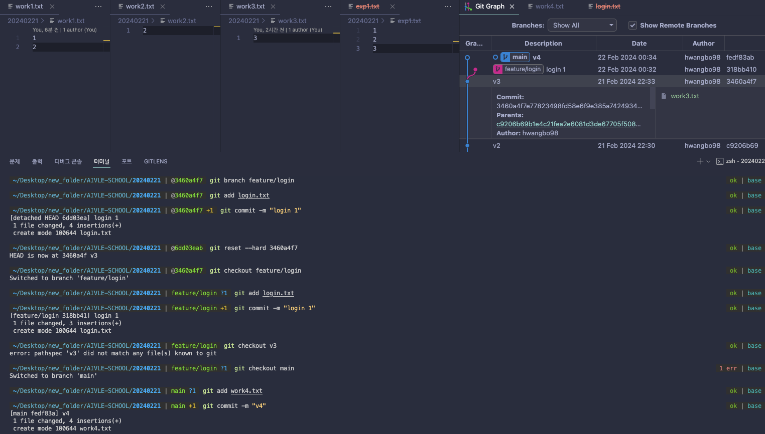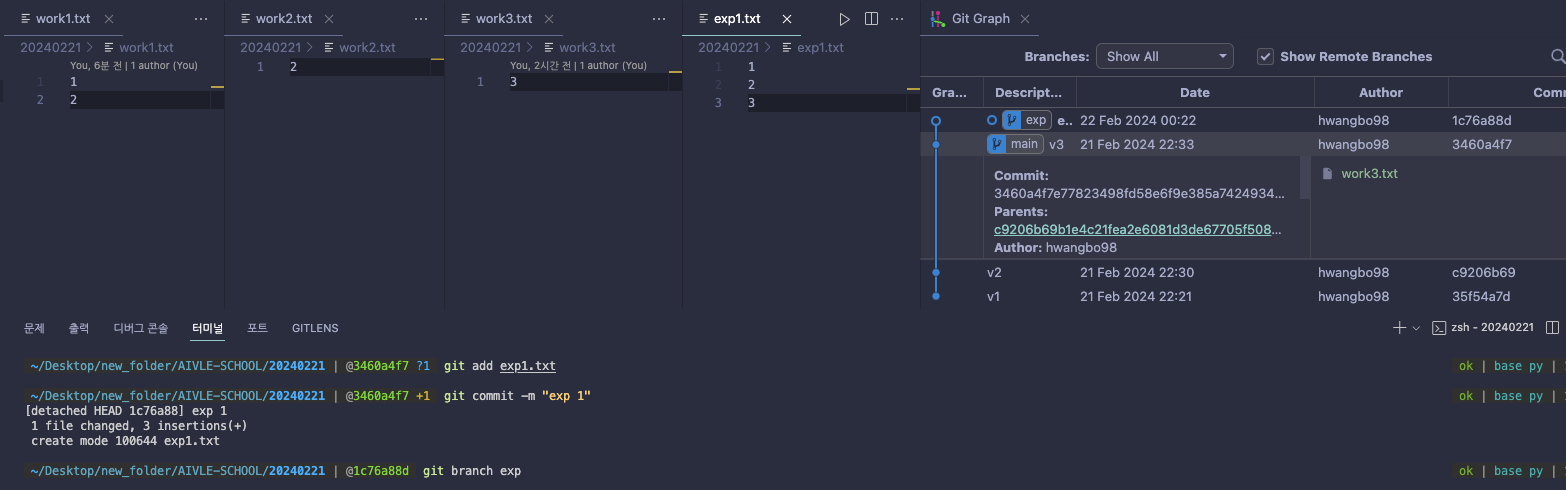 - detached HEAD를 한 뒤, 새로운 exp1.txt 파일을 생성하여 add & commit 작업을 진행