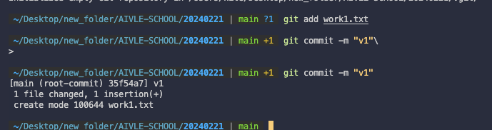 - git commit -m <메세지명> 나의 경우엔, version 1을 줄여서 v1이라고 작성했다.