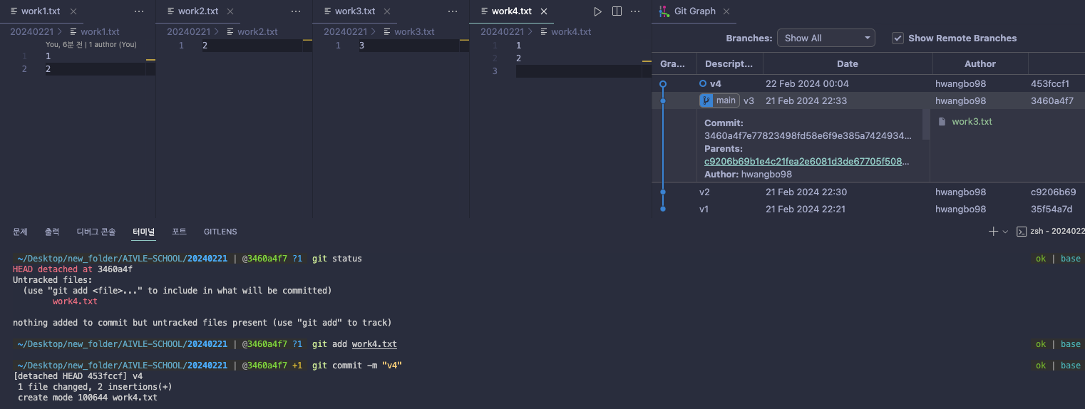 git checkout main을 한 뒤에는 v4는 사라져 버리는 것을 확인할 수 있다. 이 점은 매우 주의가 필요하다.. 작업했던 것이 사라질 수도 있으므로..!