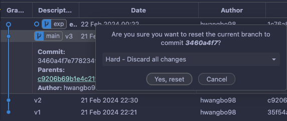 - '--hard' : HEAD를 이동시키고, 스테이징 영역과 작업 디렉토리의 변경사항도 모두 취소한다. 이 옵션은 변경사항을 완전히 제거하기에 매우 매우 주의해서 사용해야 한다.