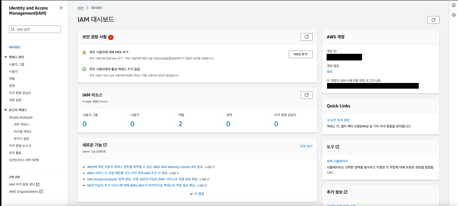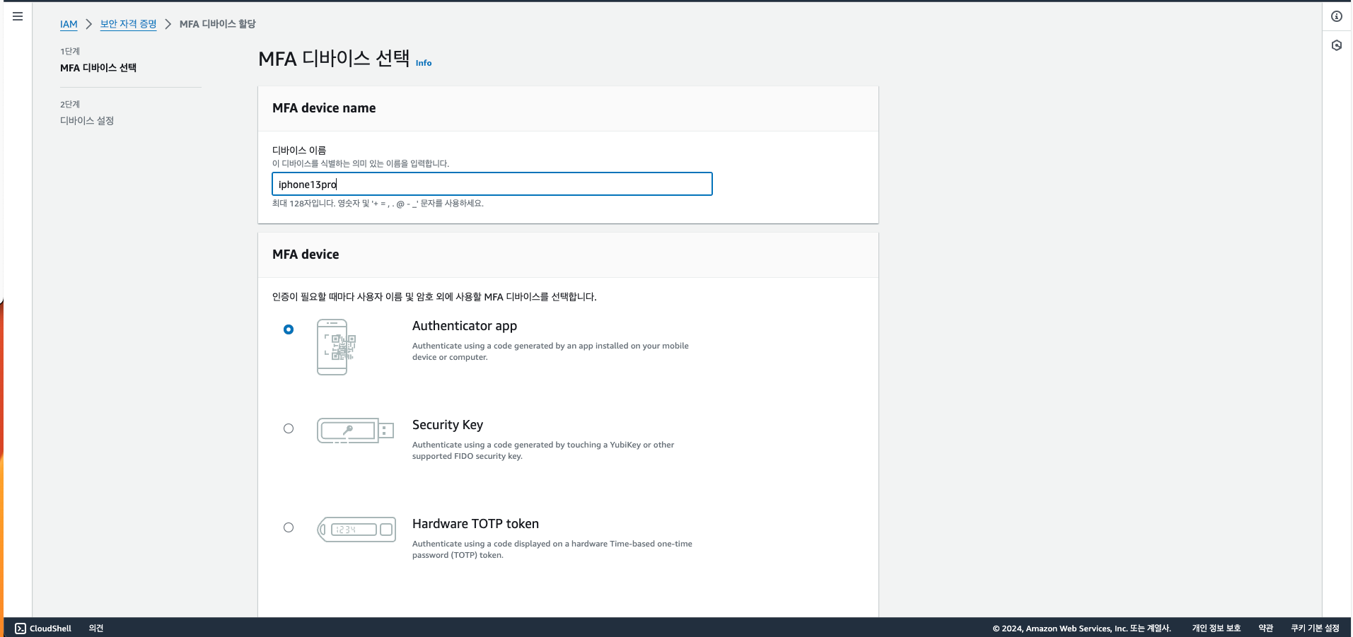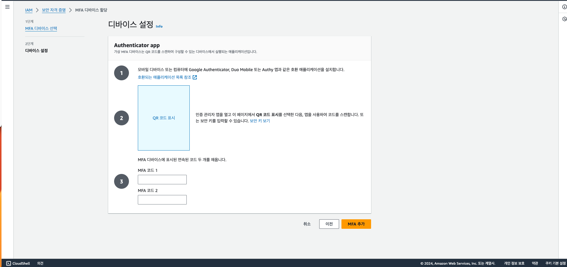 2. 보안상 이유로 운영환경에서 IAM 개별 계정에 MFA를 설정할 것을 권고합니다.