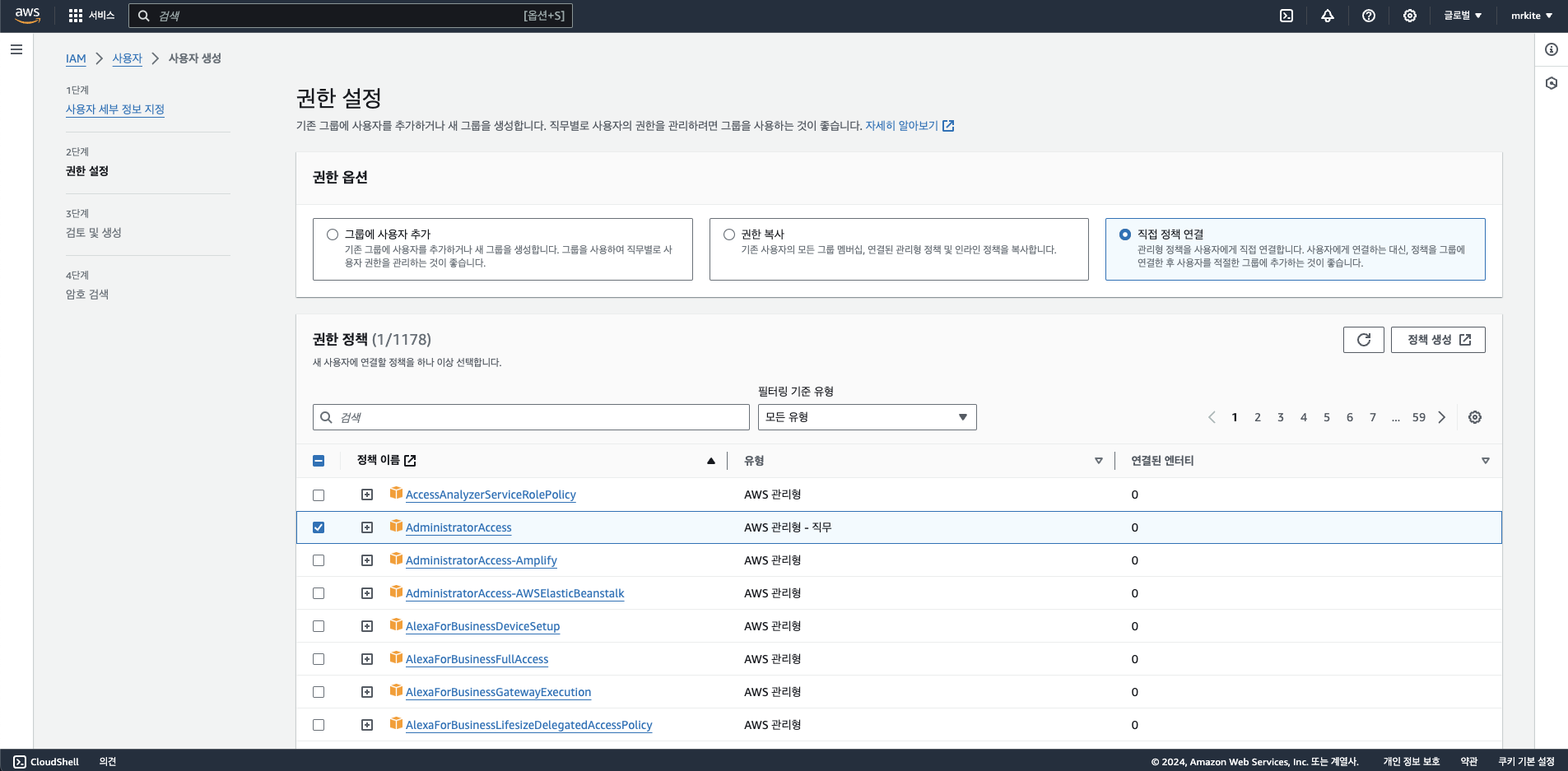 4. 저는 모든 기능에 Access 할 것이기 때문에, AdministratorAccess[관리자권한]을