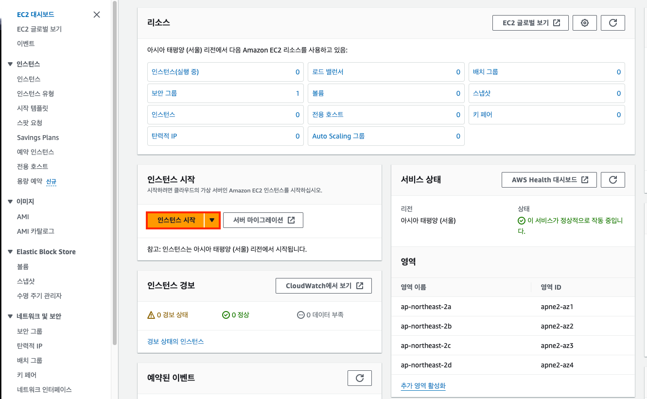 서비스 -> EC2 를 클릭하면 이 화면이 나올 것입니다.