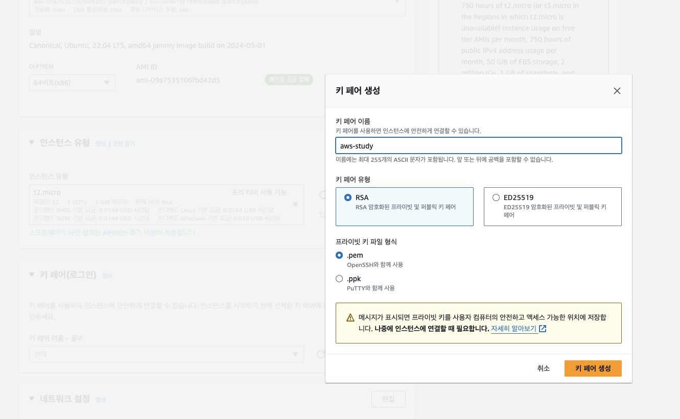 대망의 가장 중요한 키페어 생성 버튼입니다! 만약 다른 인스턴스를 생성하다가