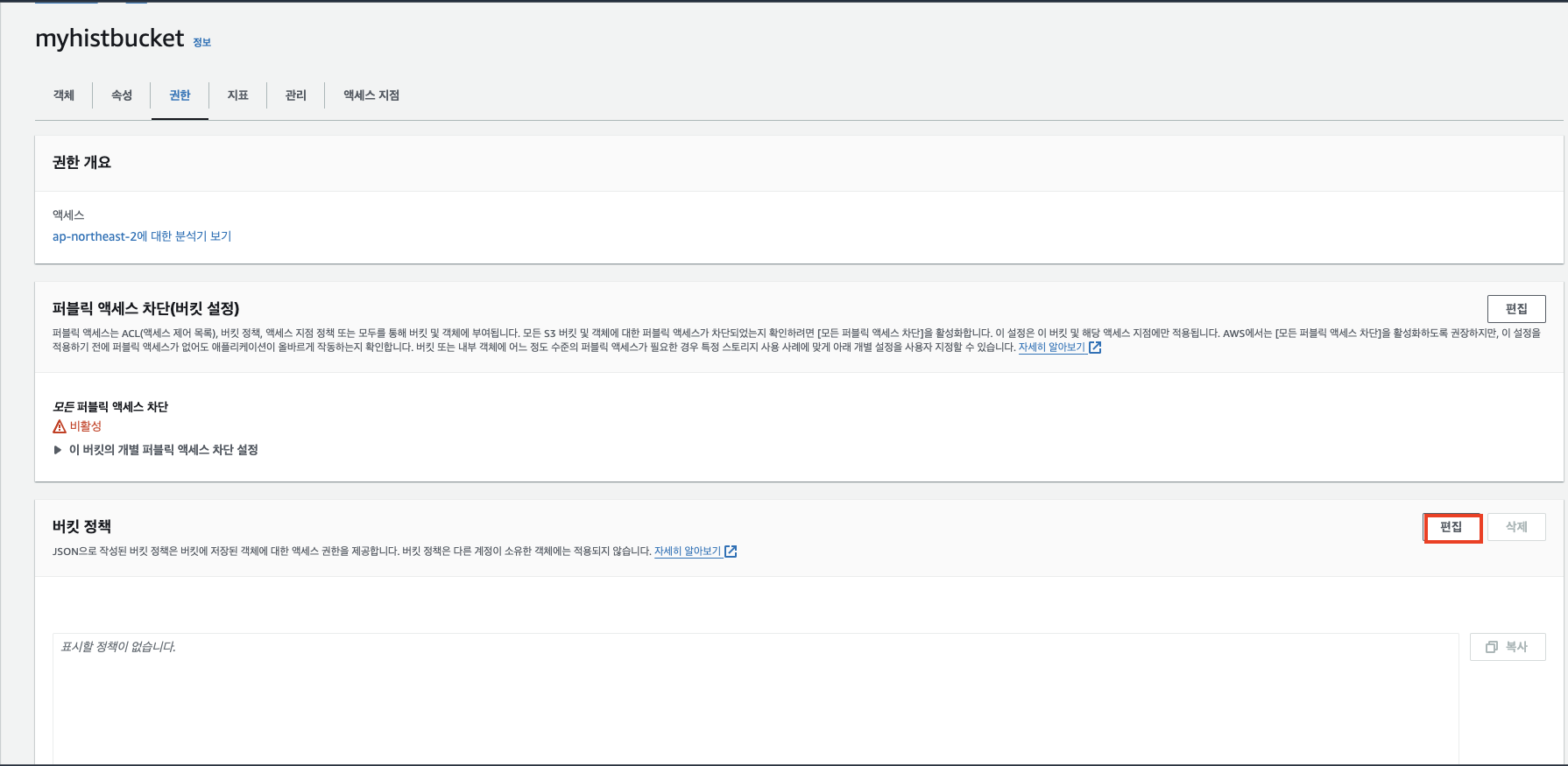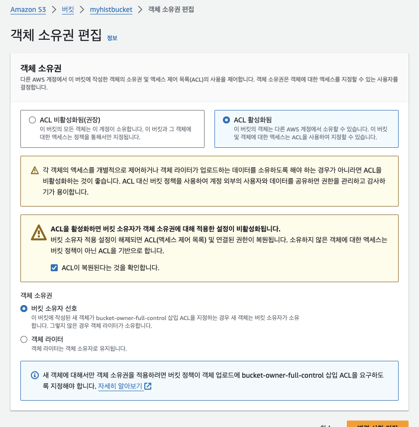 myhistbucket에서 권한 -> 객체 소유권 편집을 클릭해서 ACL 활성화됨을 클릭합니다.