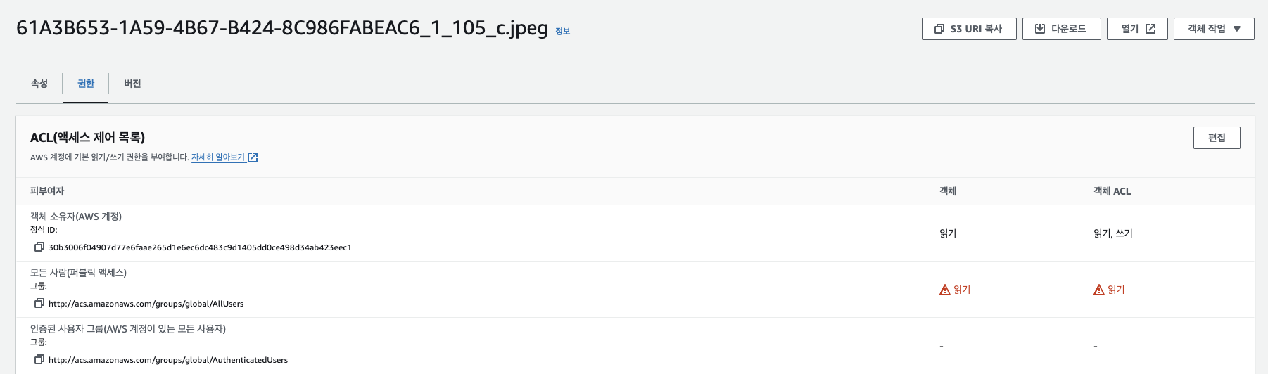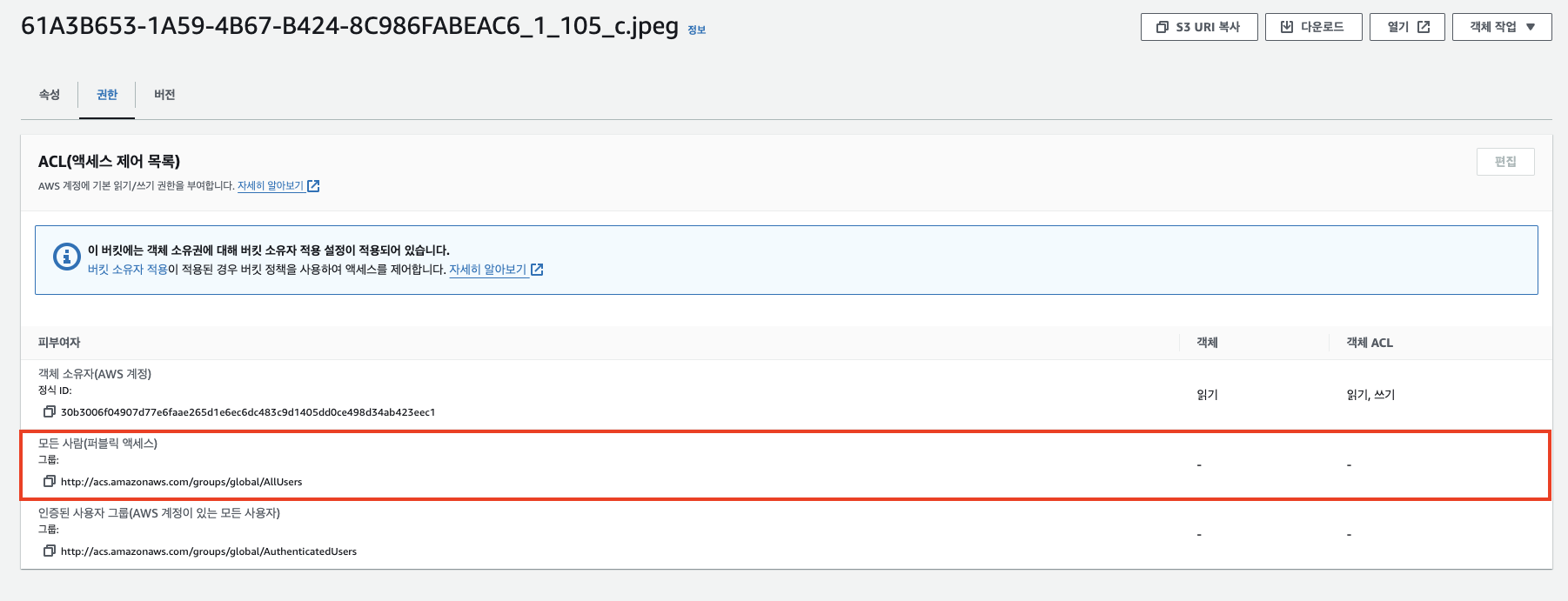 ACL -> 편집 -> 모든 사람[퍼블릭 액세스] 에서 객체, 객체 ACL 모두 읽기 권한을 활성화 해줍니다.