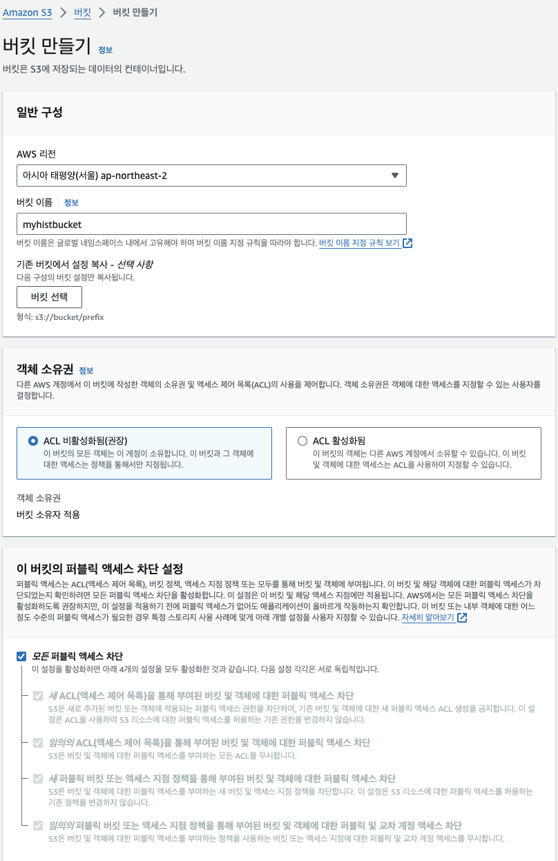 버킷이름은 본인이 원하는 이름으로 선택해줍니다. 저는 간단하게 myhistbucket으로 선택해주었습니다.