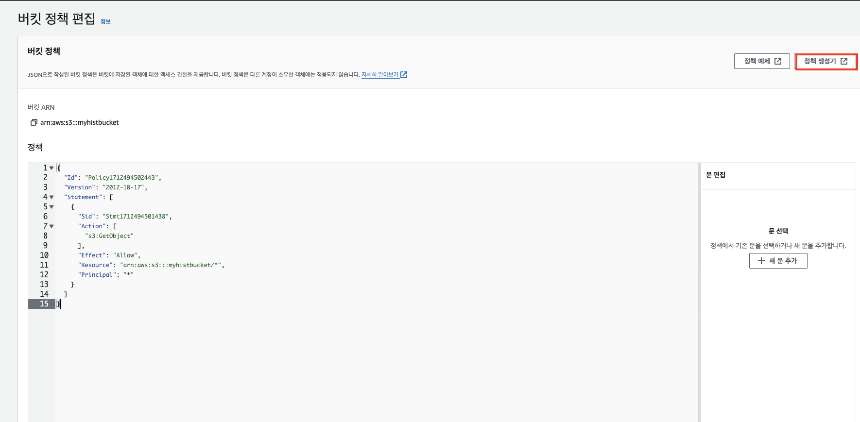 권한 -> 버킷 정책 -> 편집을 클릭해줍니다.