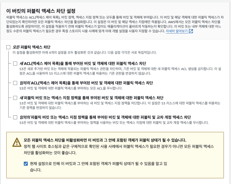 그리고 일단 연습용으로 만들었기 때문에 모든 퍼블릭 액세스 차단 버튼을 해제합니다.