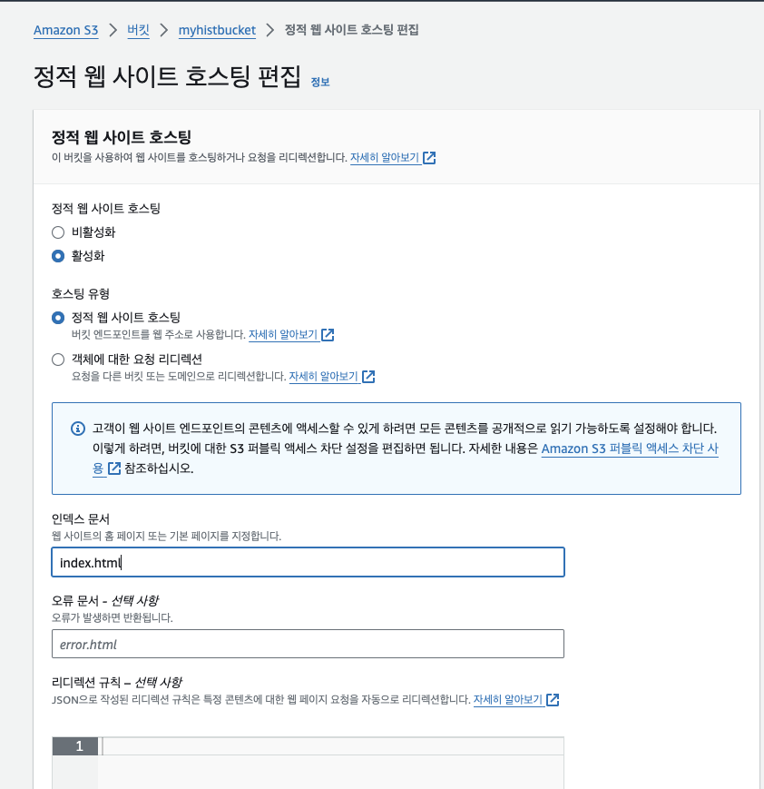 버킷 -> 속성 -> 정적 웹 사이트 호스팅 편집을 클릭해 줍니다.
