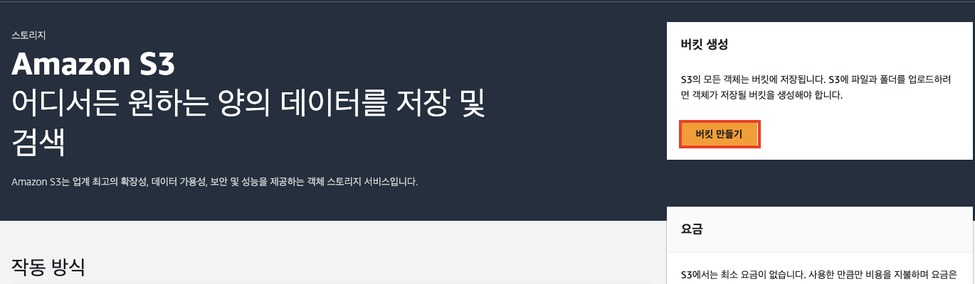 AWS에서 S3를 검색한 뒤, 버킷 만들기를 누릅니다.