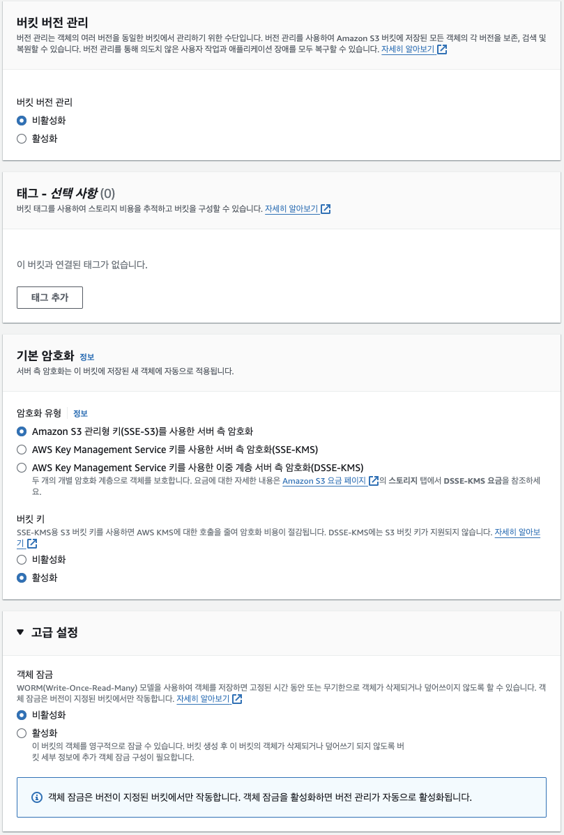 나머지 설정들은 기본으로 선택되어있는 값들을 선택해주었습니다. 아직 Key Management Service에 대해선 다루지 않았으므로.. SSE-S3를 사용한 서버 측 암호화로 선택해주었습니다.