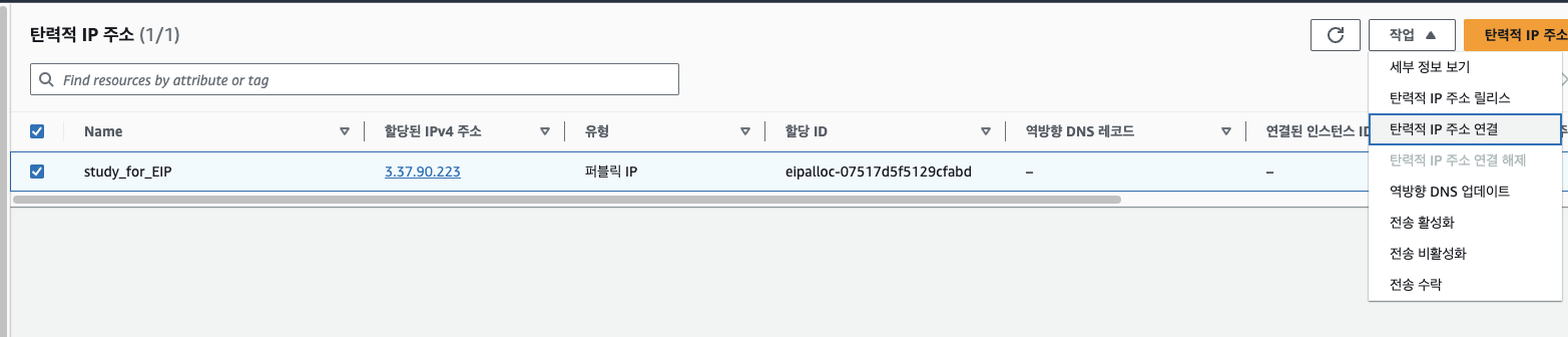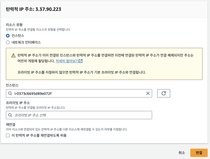 - 하나의 Elastic IP는 한 번에 하나의 인스턴스에만 연결 가능합니다.