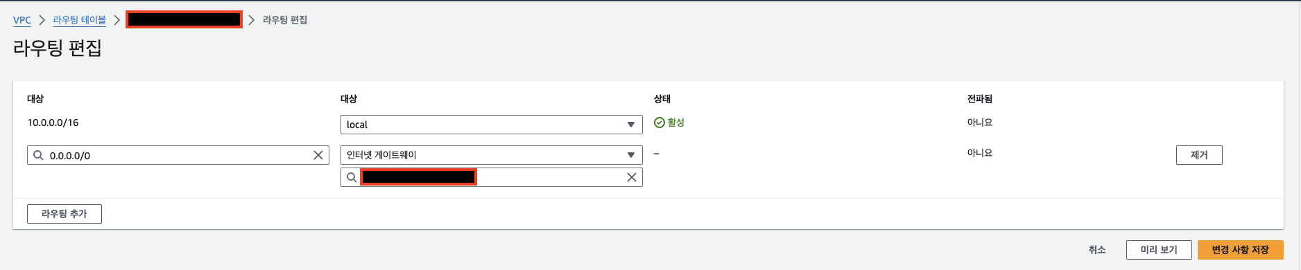 8. 라우팅 편집 버튼을 눌러줍니다. 5단계에서 만든 인터넷 게이트웨이를 추가해줍니다.