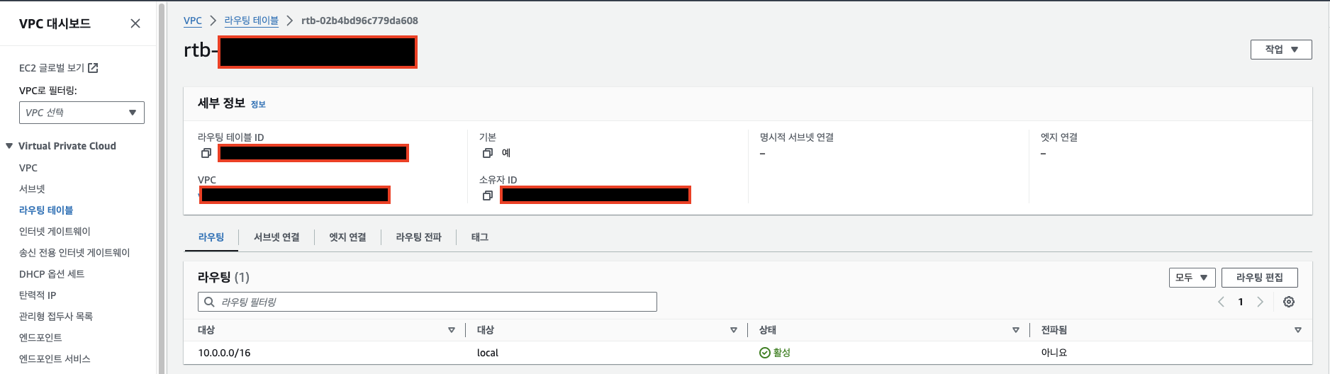 - 목적지까지의 경로[Target]: 트래픽을 전달할 네트워크 게이트웨이, 예를 들어 인터넷 게이트웨이, NAT 게이트웨이, 또는 VPC 피어링 연결 등입니다.