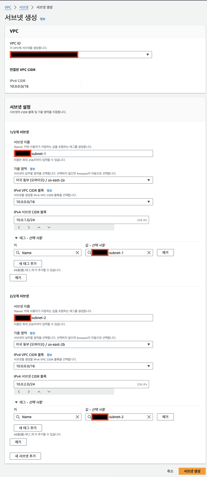IPv4 서브넷 CIDR 블록에는 subnet-1은 10.0.1.0/24, subnet-2는 10.0.2.0/24로 설정해줍니다.