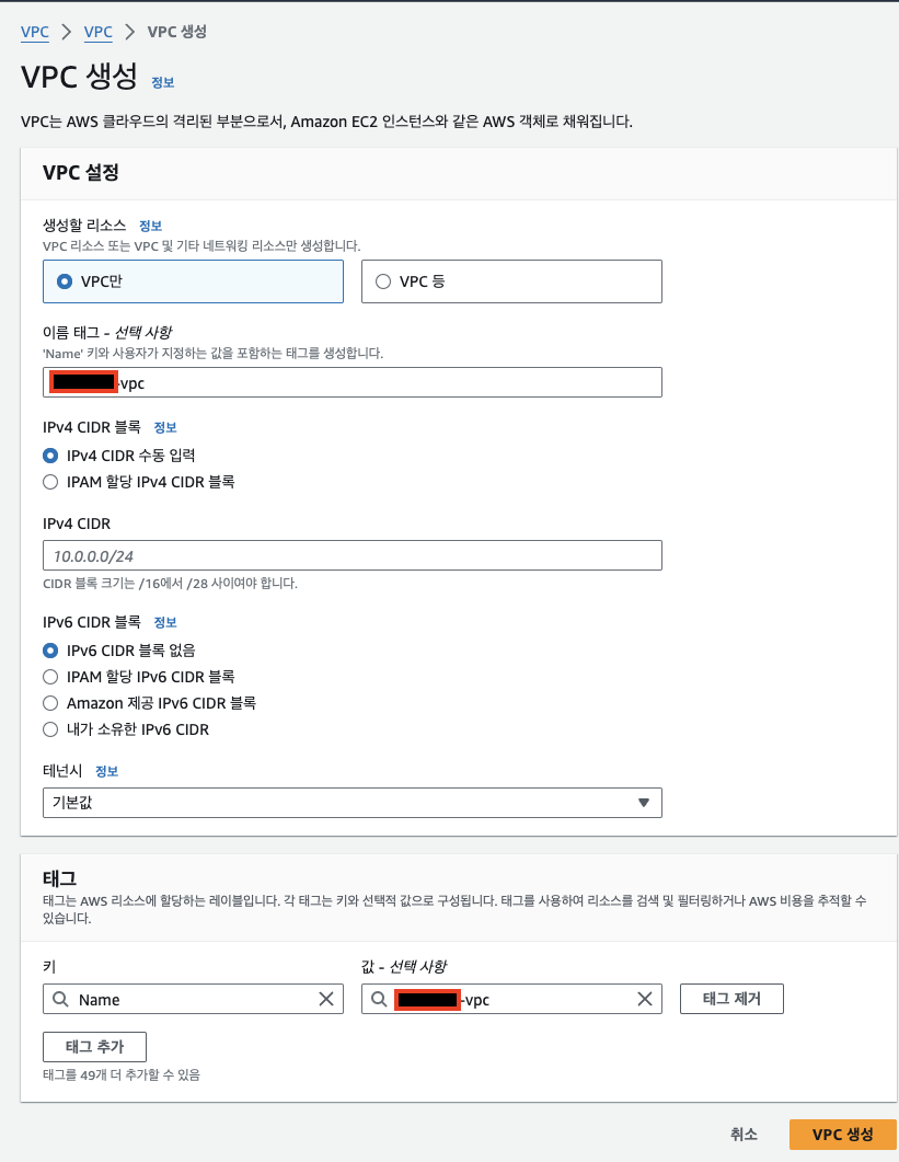 2. VPC 생성 버튼을 눌러주고, IPv4 CIDR은 10.0.0.0/16로 256개의 IP 주소를 제공하는 것을 사용합니다.