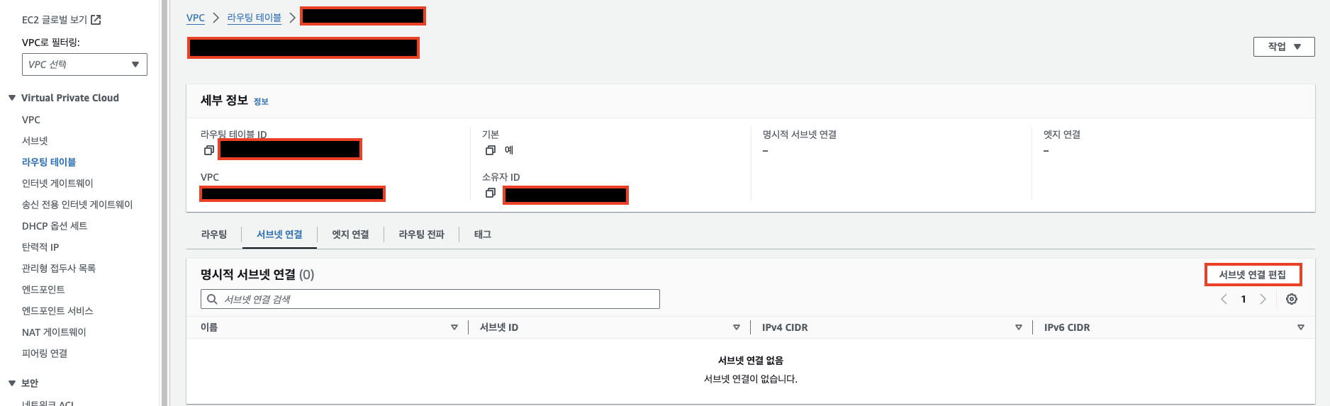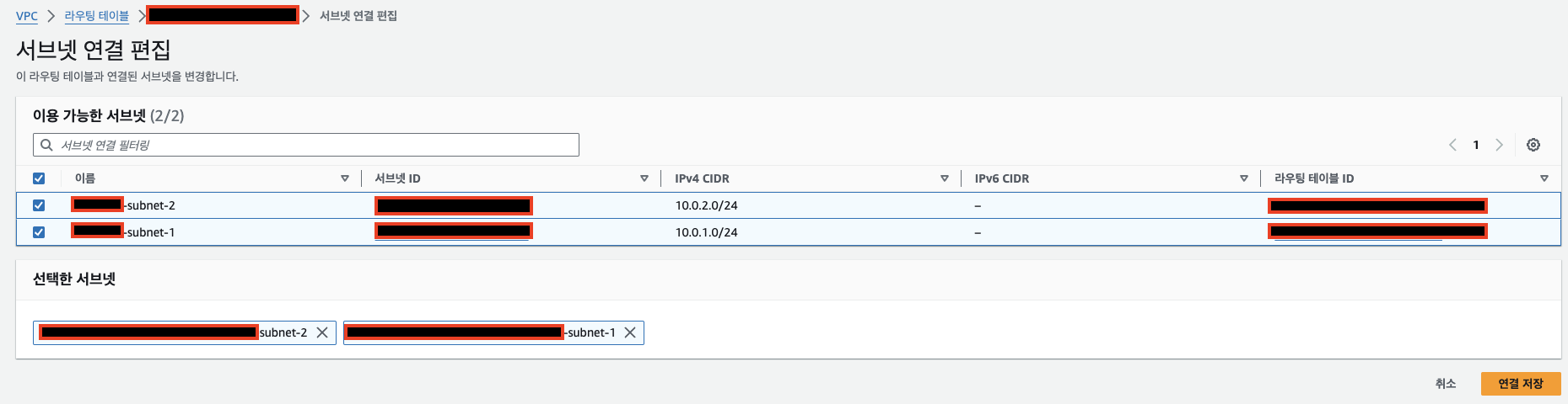 9. 서브넷 연결 편집을 통해 아까 만들었던, 서브넷 두개를 라우팅 테이블에 연결해줍니다.