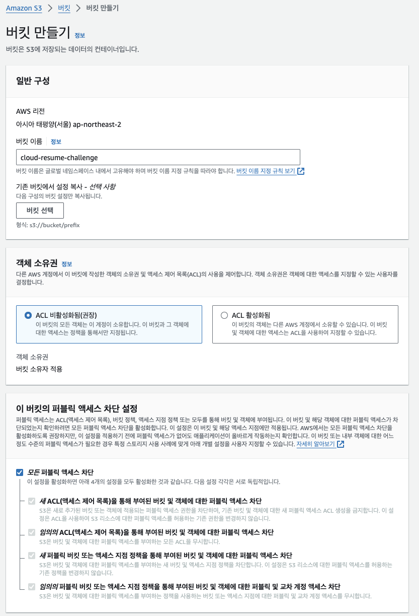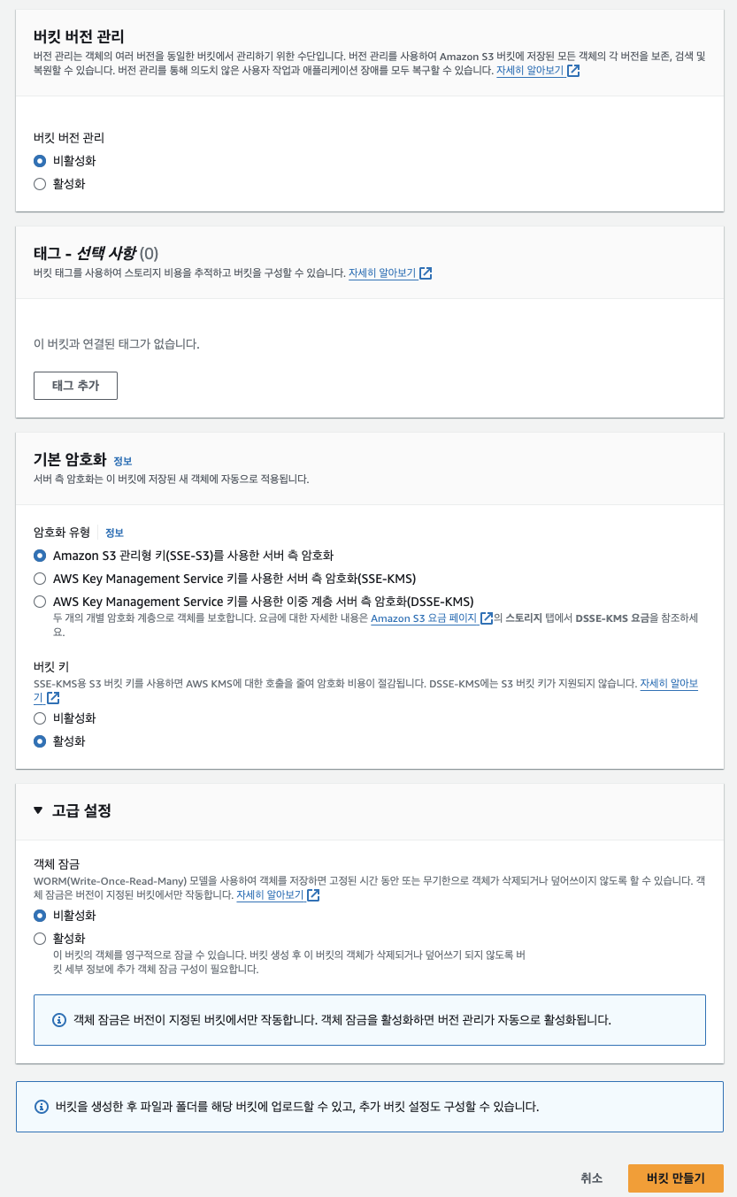 여기서 가장 중요한 것은 버킷 이름입니다. 버킷 이름의 경우에는 중복이 되면 안되기 때문에 뒤에 제 이름을 넣어서 만들어줬습니다.
