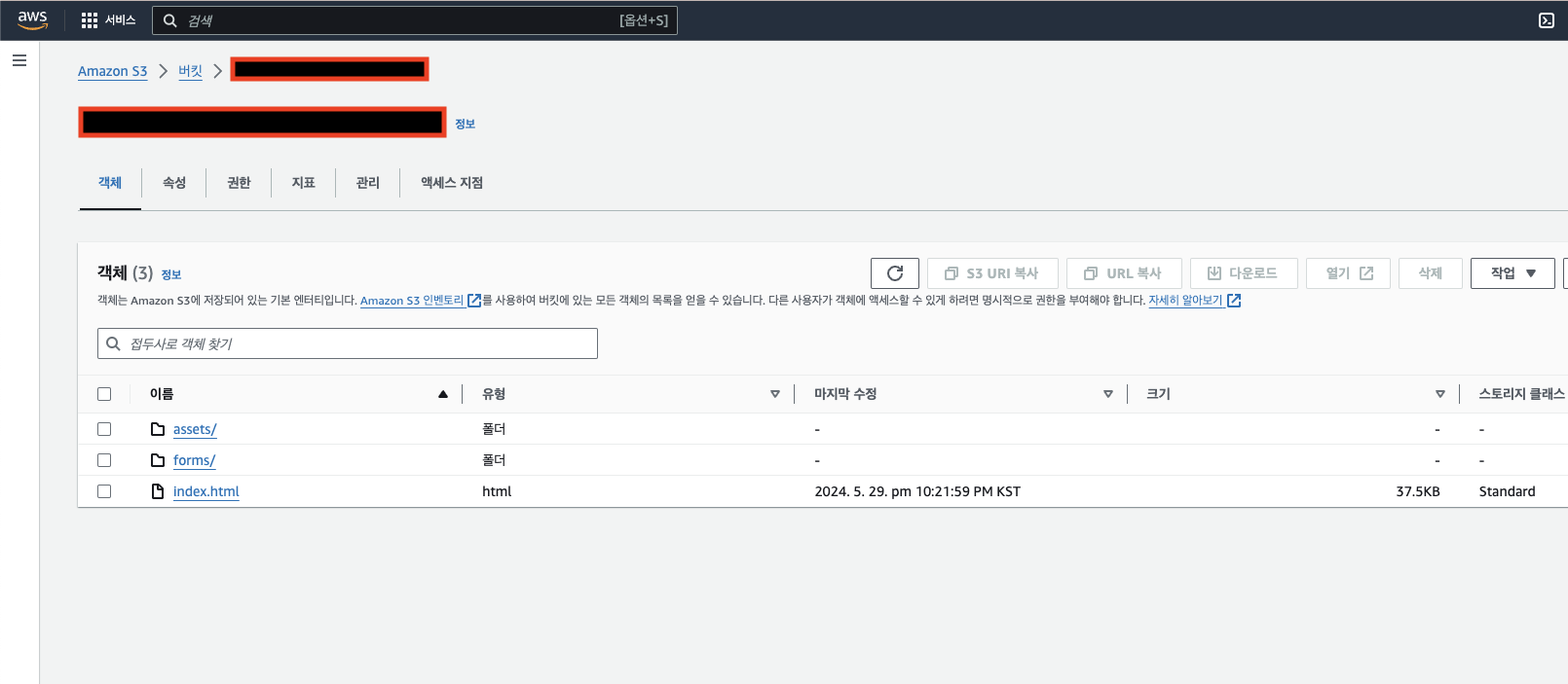 a. S3에 파일들을 업로드 합니다. 여기서 중요한 것은 html 파일을 전체 폴더를 만들어서 하위에다가 넣은 다음에 큰 폴더를 넣는 것이 아니라 바로 html파일을 업로드 해주고, 그 외의 파일들도 이렇게 업로드 시켜주는 것입니다. 그래야 추후에 오류가 안생긴다고 합니다.