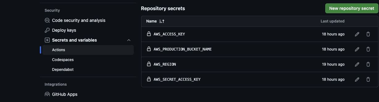 4. 아까 발급받은 키를 New repository secret을 하나씩 추가해서 등록해줍니다. value에는 값만 들어가도록 하면 됩니다.