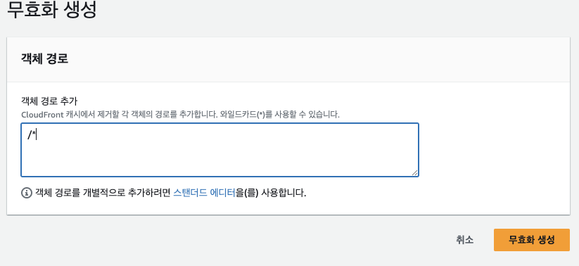 2. 객체 경로에 /*를 입력하여 모든 파일의 캐시를 무효화합니다. 그리고 무효화 생성 버튼을 눌러줍니다.