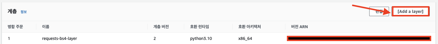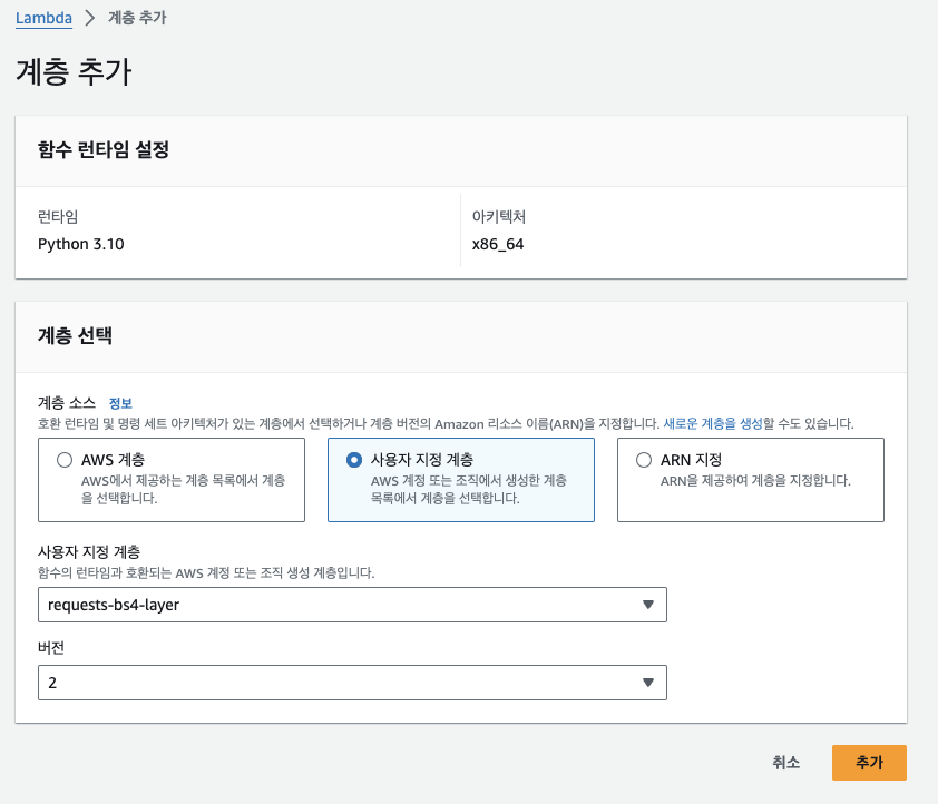 사용자 지정 계층을 누르고, 아까 생성해 놨던 requests-bs4-layer를 선택합니다. 그리고 버전을 선택한 뒤 추가를 해줍니다.