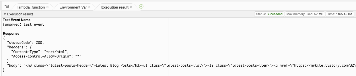 이건 제가 Lambda에 넣을 때 사용할 파이썬 코드를 만들었습니다. 제가 가져올 건 블로그 제목, 날짜, 그리고 썸네일 사진 주소, 게시물 주소 였습니다. 그래서 이렇게 해서 다 가져왔습니다. 실제로 로컬에서 파이썬을 테스트 해봤을 때 정상적으로 잘 떠서 이대로 사용하기 결정했습니다!!