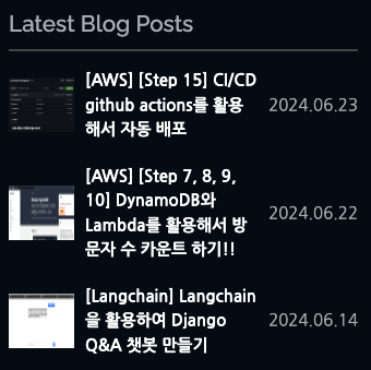 Html, Css, Javascript를 살짝 수정해주니까 성공적으로 나오는 모습까지 볼 수 있었습니다!! 꽤나 시간이 오래걸렸습니다.. 하지만.. 다시 한번 갓람다.. 진짜 크롤링부터 거의 실시간으로 가져오는 모습을 보고.. 너무 신기했습니다. 사실 블로그를 이렇게 작성하는 것도 적었을 때 이제 저기 최신 3개에 이 블로그도 나오는지가 너무 궁금하고, 저 처럼 이거 도전해보고 싶으신 분들에게 도움이 되고자 적어봤습니다.