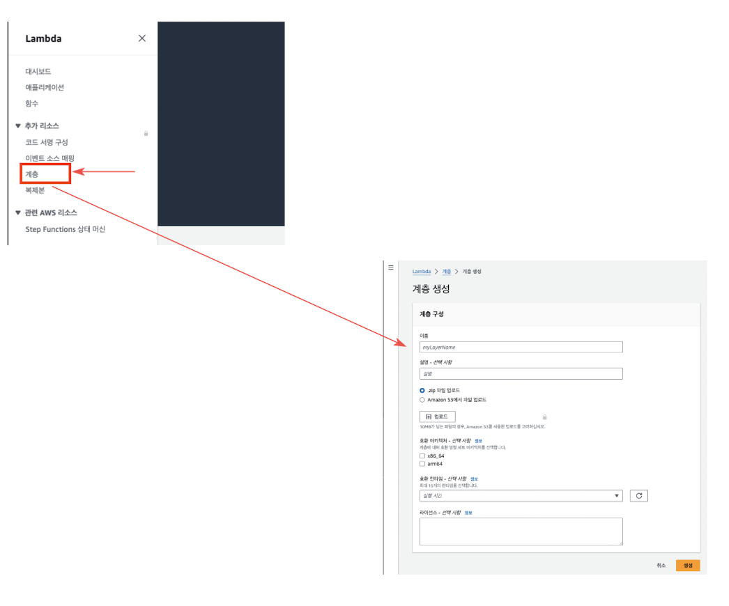 2. Lambda 콘솔에서 Layer를 생성합니다.