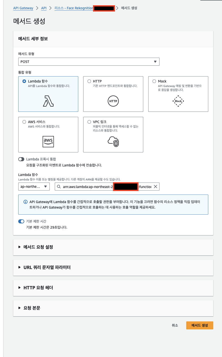 제가 이 부분은 Lambda 프록시 통합을 체크 해주지 않았는데, 이 부분을 체크해줬습니다.
