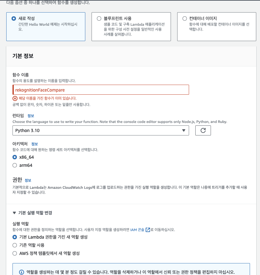 저는 이렇게 Lambda 함수를 하나 생성했습니다. 제가 매우 중요한 사실을 잊고 있었습니다... 여기서 가장 중요한 건 실행 역할 부분입니다 진짜 이것때매 엄청 애먹었습니다..