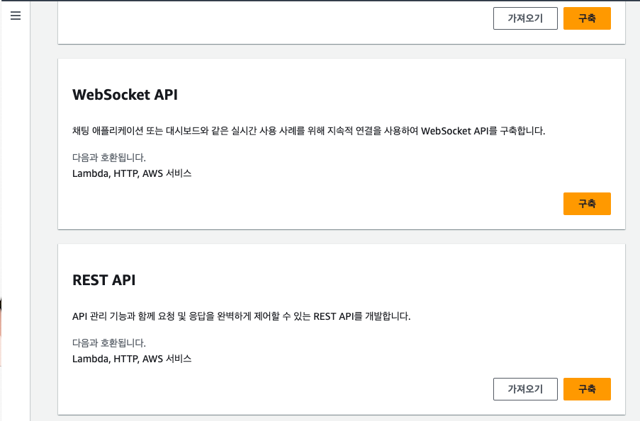 API Gateway의 Rest API는 HTTP를 기반으로 하는 RESTful API를 ㅅ생성, 배포 및 관리할 수 있게 해주는 서비스 입니다.