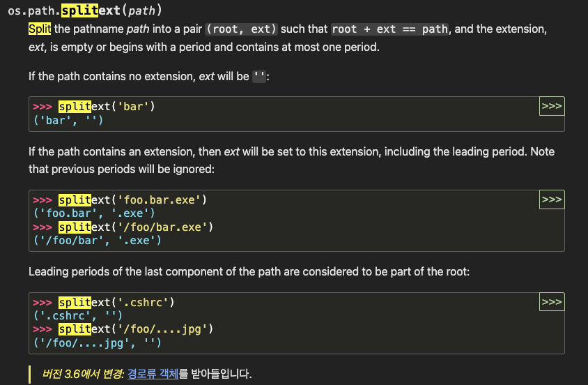 - splittext는 파일명을 입력으로 받아 확장자 전까지의 파일 이름과 확장자를 분리해서 반환