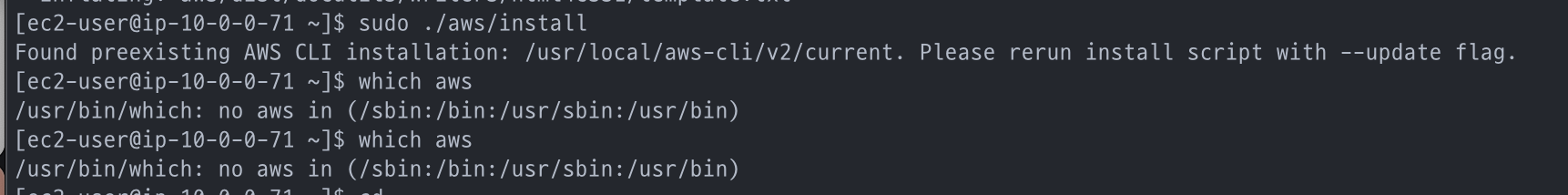 aws-cli를 분명 설치해줬음에도 불구하고, aws를 찾을 수 없음을 알게 되었다.. 결국 이 모든 것은 $PATH의 문제였다.. 그래서 결국 vim ~/.bashrc 명령어를 통해서 경로를 아예 /usr/local/bin 으로 변경해주었다..