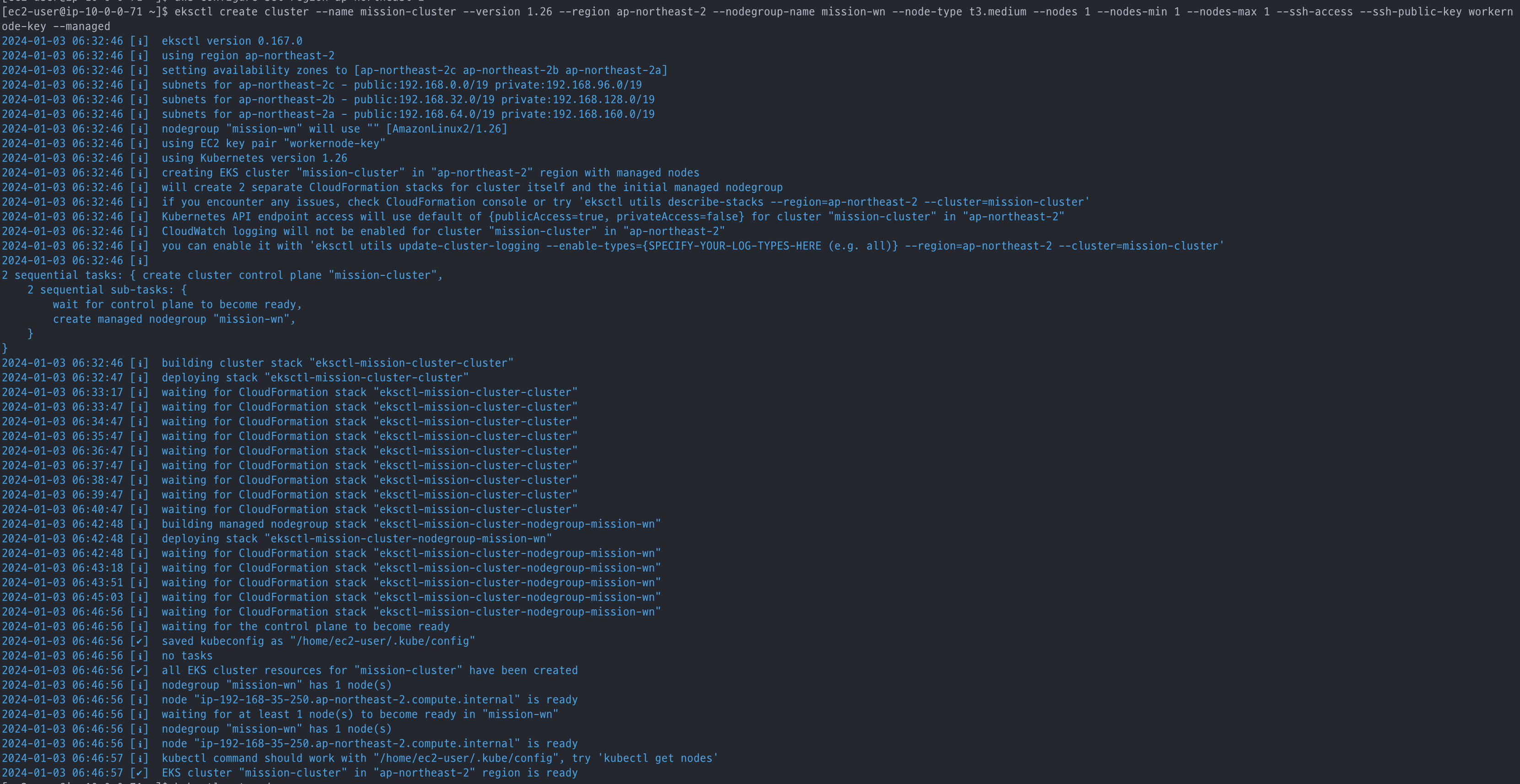 eksctl create cluster --name mission-cluster --version 1.26 --region ap-northeast-2