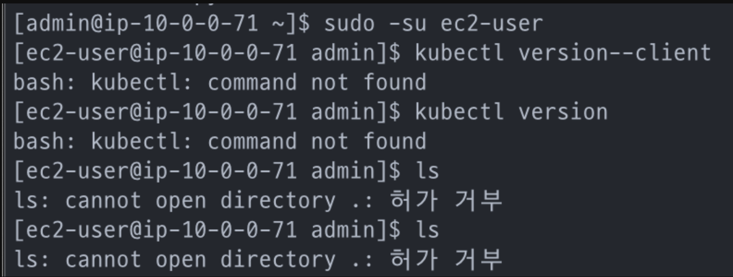 처음에 관리자로 들어간 뒤 sudo -su ec2-user로 들어가서 작업을 진행하려고 하니까 계속 허가 거부 즉, Permission denied가 떴다.... 알고보니 admin 폴더에서 작업을 하려고 하니 문제가 발생했던 것이다.. 그래서 바로 폴더를 ec2-user로 바꿔주니 이상없이 진행되었다.